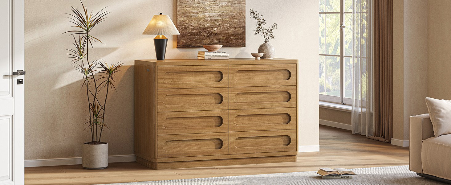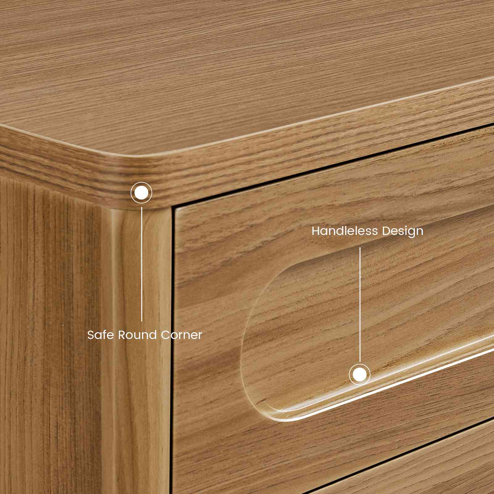 【Modern Curved Design】This wooden deep drawer dresser, with its distinctive curved design, perfectly blends modern elegance with practical simplicity, adding visual interest and a contemporary feel to any room. The handleless design creates a clean and aesthetically pleasing aesthetic, while the rounded corners and floor-standing, thickened base enhance security