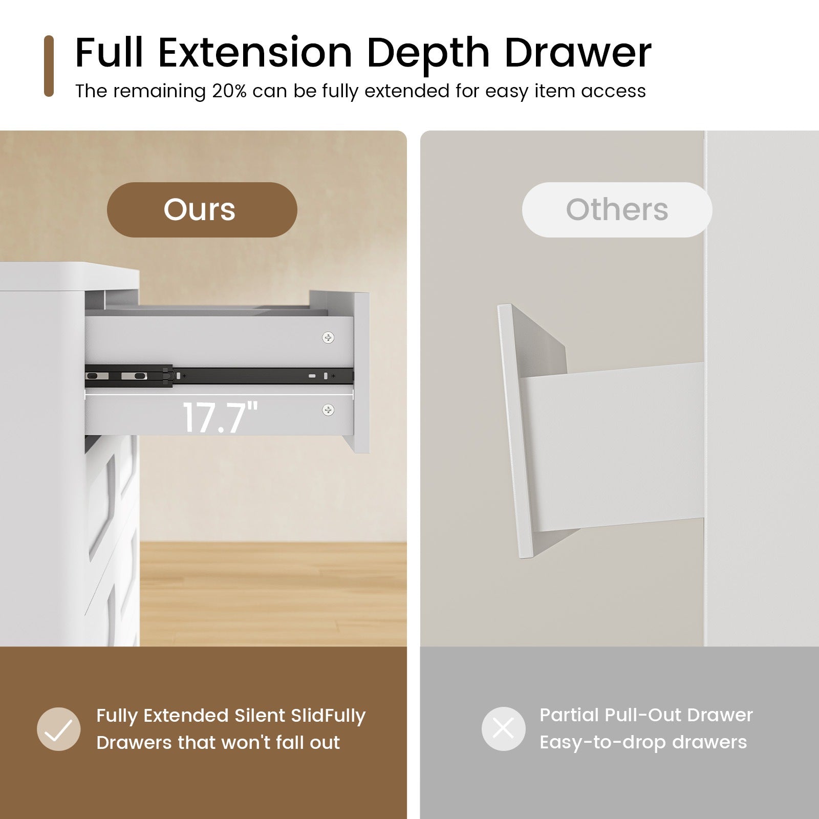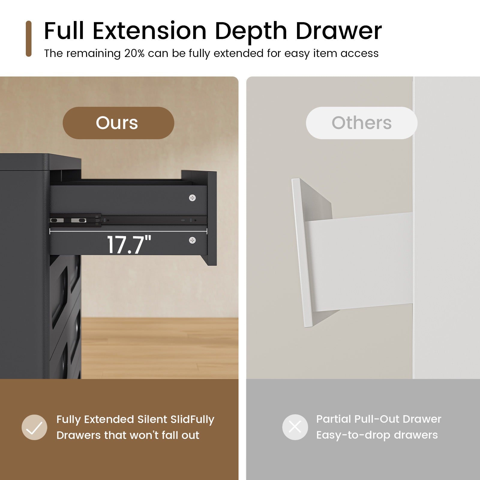 【Extra Deep Drawers】This bedroom dresser features a spacious design with 20% deeper drawers. High-quality three-section slides allow the drawers to extend fully and prevent them from falling. Easily store a variety of clothing, accessories, and household items while keeping the space neat and organized.Drawer Dimensions: 17.7"D x 22.2"W x 5.5"H