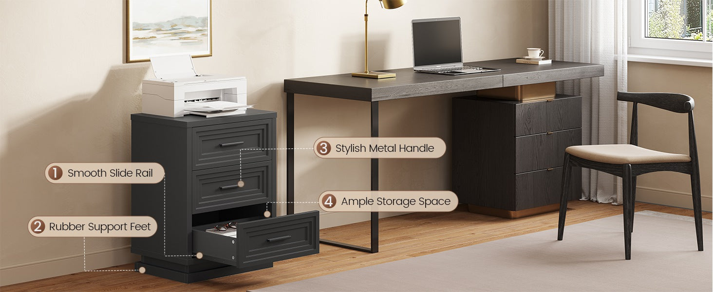 【Versatile Side Table】This 3 drawers nightstand is not only perfect for a bedside table in bedrooms but also ideal as an end table or side table next to your sofa, armchair in your living room, hallway, or office. Its scratch-resistant and waterproof surface and sturdy structure ensure that it can be used in different scenarios.