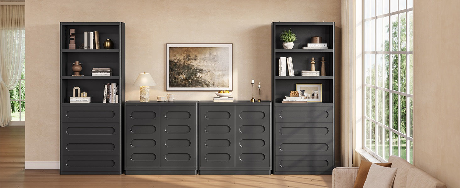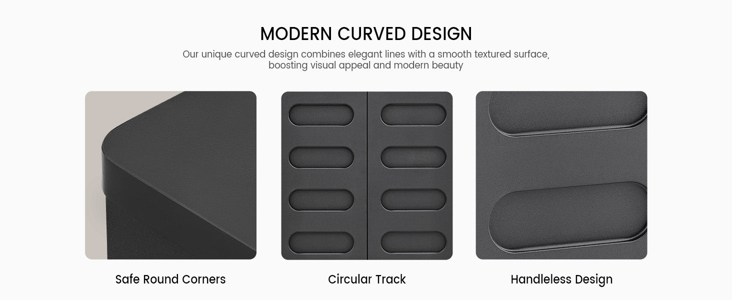 【Modern Curved Design】The storage cabinet boasts a delicate, curved design, resulting in a unique cabinet shape. Its rounded corners and handleless design create a stylish yet distinct look. This unique design adds a touch of sophistication and style to your living space, enhancing the overall aesthetic of your home decor