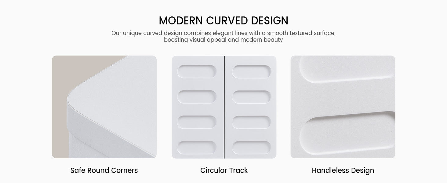 【Modern Curved Design】The storage cabinet boasts a delicate, curved design, resulting in a unique cabinet shape. Its rounded corners and handleless design create a stylish yet distinct look. This unique design adds a touch of sophistication and style to your living space, enhancing the overall aesthetic of your home decor