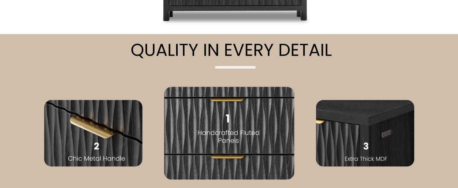 • Modern Chic Design: Wave-like fluted panels with golden handles.