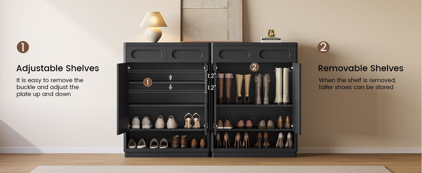 【Versatile Flexible Storage 】This shoe cabinet features a convenient design. The top drawer can store essentials like keys and a wallet. The shoe cabinet with doors also features adjustable shelves to accommodate shoes of various sizes. The open space at the bottom further enhances the convenience of storing shoes. The perfect combination of functionality and organization makes it an indispensable part of your home