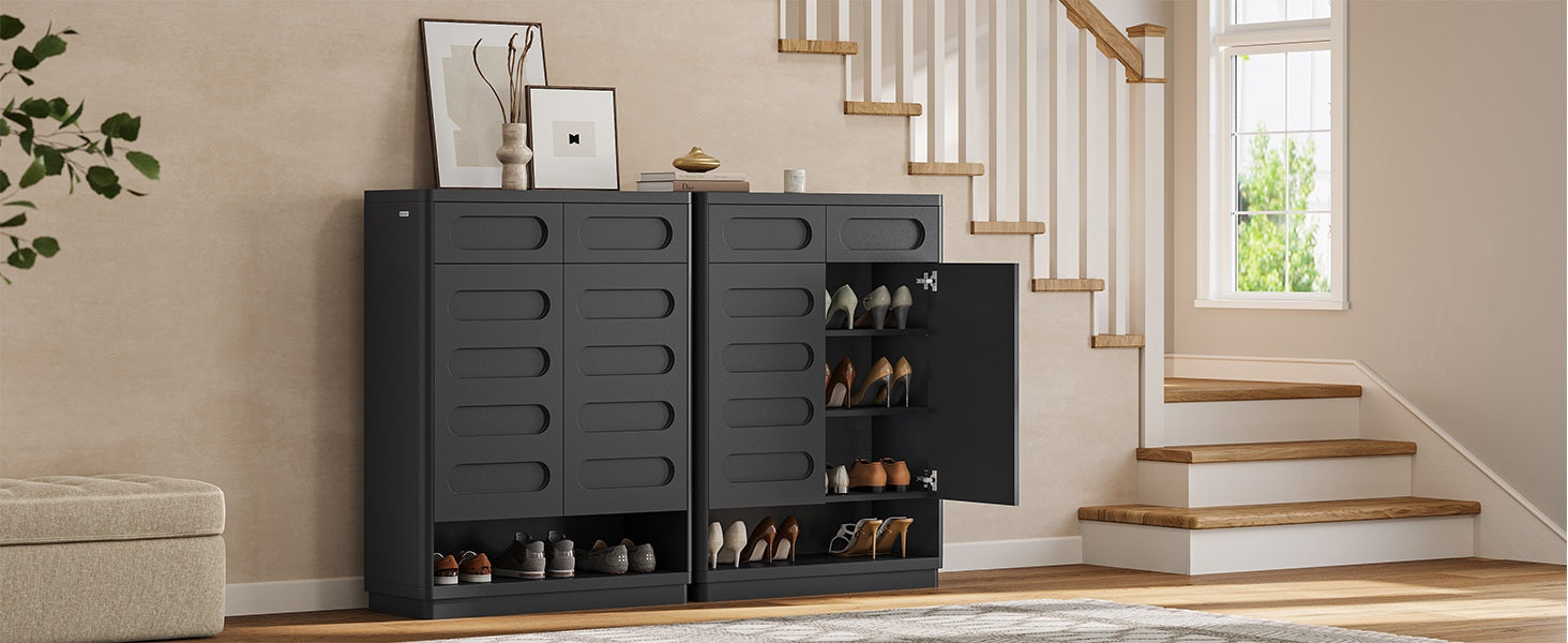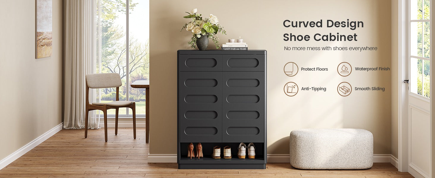 【Modern Curved Design】This shoe storage organizer cabinet achieves a perfect design of curved edges, adding a touch of modern elegance to your entrance, hallway, or living room. The stylish handleless design adds visual appeal, and the rounded corners provide extra security, making it suitable for any home style