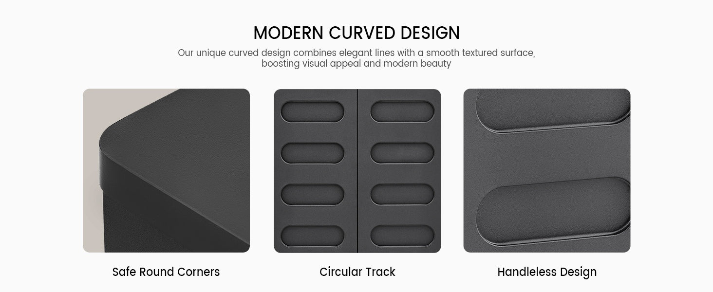• Modern Curved Design: Handleless, rounded corners, stylish and safe.