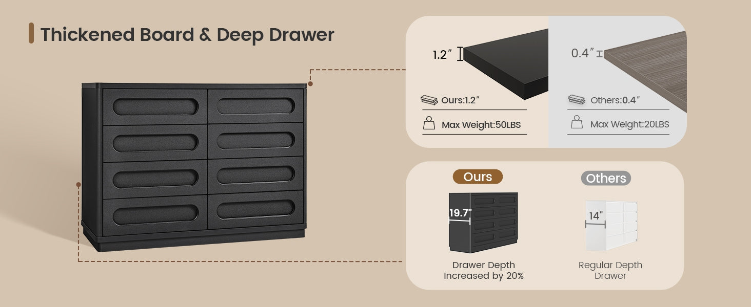 【Quality Material and Sturdy Durable】This bedroom dresser is crafted from premium, thickened engineered wood, 50% thicker than conventional wood to ensure long-lasting use and a strong load-bearing capacity. Each drawer can support up to 35 pounds, and the tabletop can support up to 400 pounds. An anti-tip device prevents shaking or tipping, ensuring the safety of family and pets