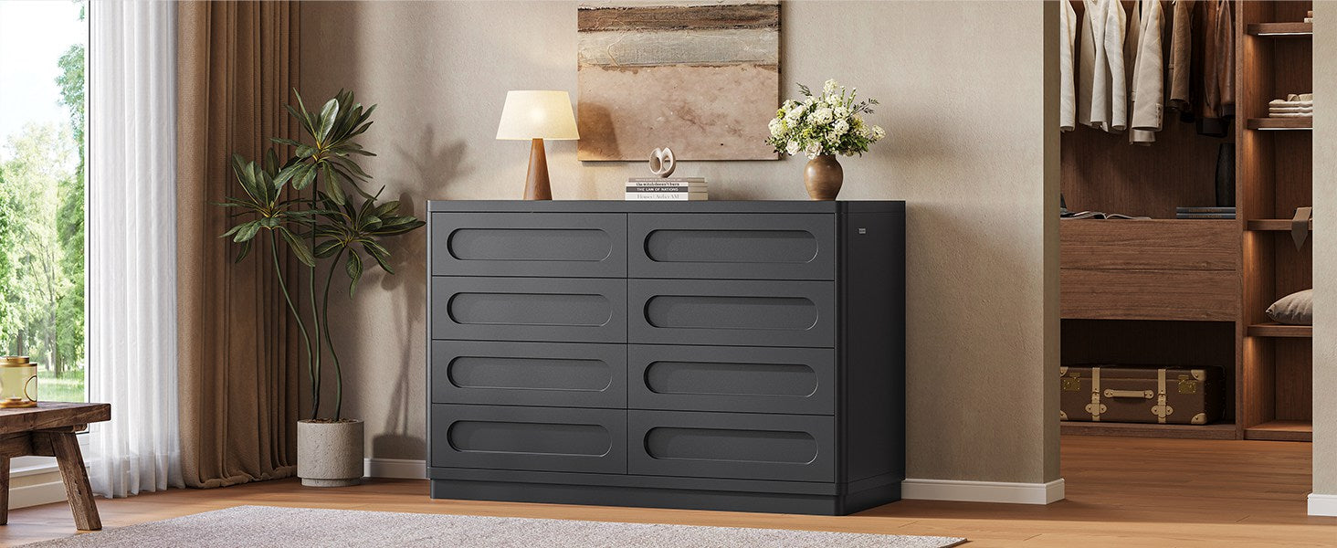 【Large Storage Capacity】The dresser for closet features 8 deep drawers that provide plenty of room for organizing clothing, bedding, cosmetics, or jewelry, helping you maintain a neat and tidy space. The wide wooden tabletop can serve as a dresser TV stand, or display your decorations such as photo frames, plants and mirrors