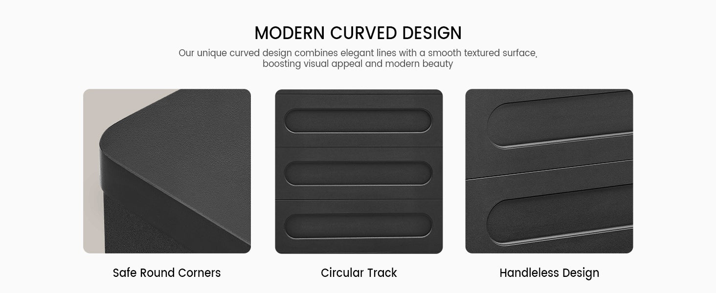 • Modern Curved Design: Handleless, rounded corners, thickened base.