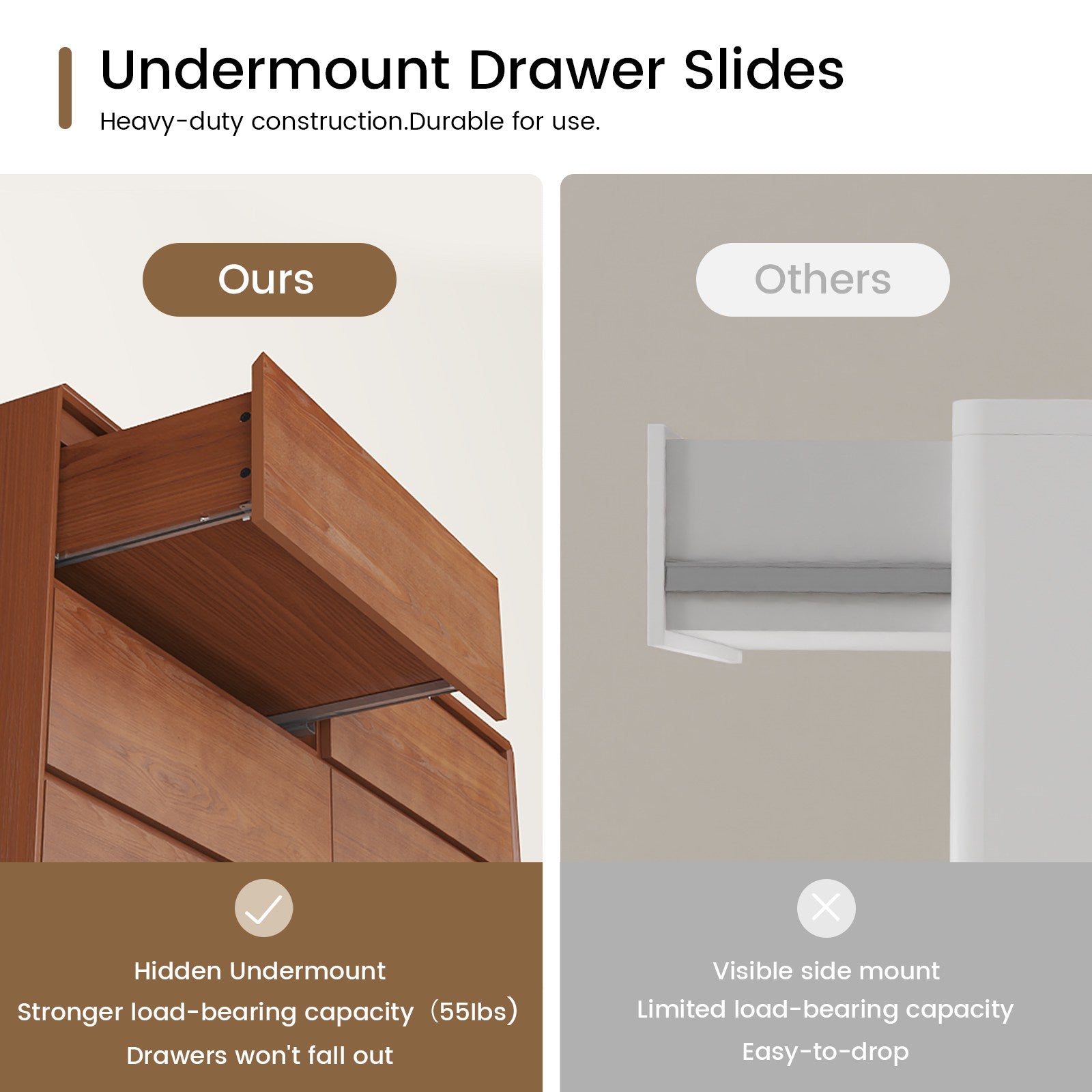 【Sturdy and Durable】The dressers & chests of drawers are designed for stability and longevity. The safe round corners of the tabletop, floor-standing base, and anti-tilt device greatly enhance safety. The feet can protect your floor from being scratched. The premium waterproof surface is easy to clean. The drawers open and close easily, and the slides are smooth and silent.
