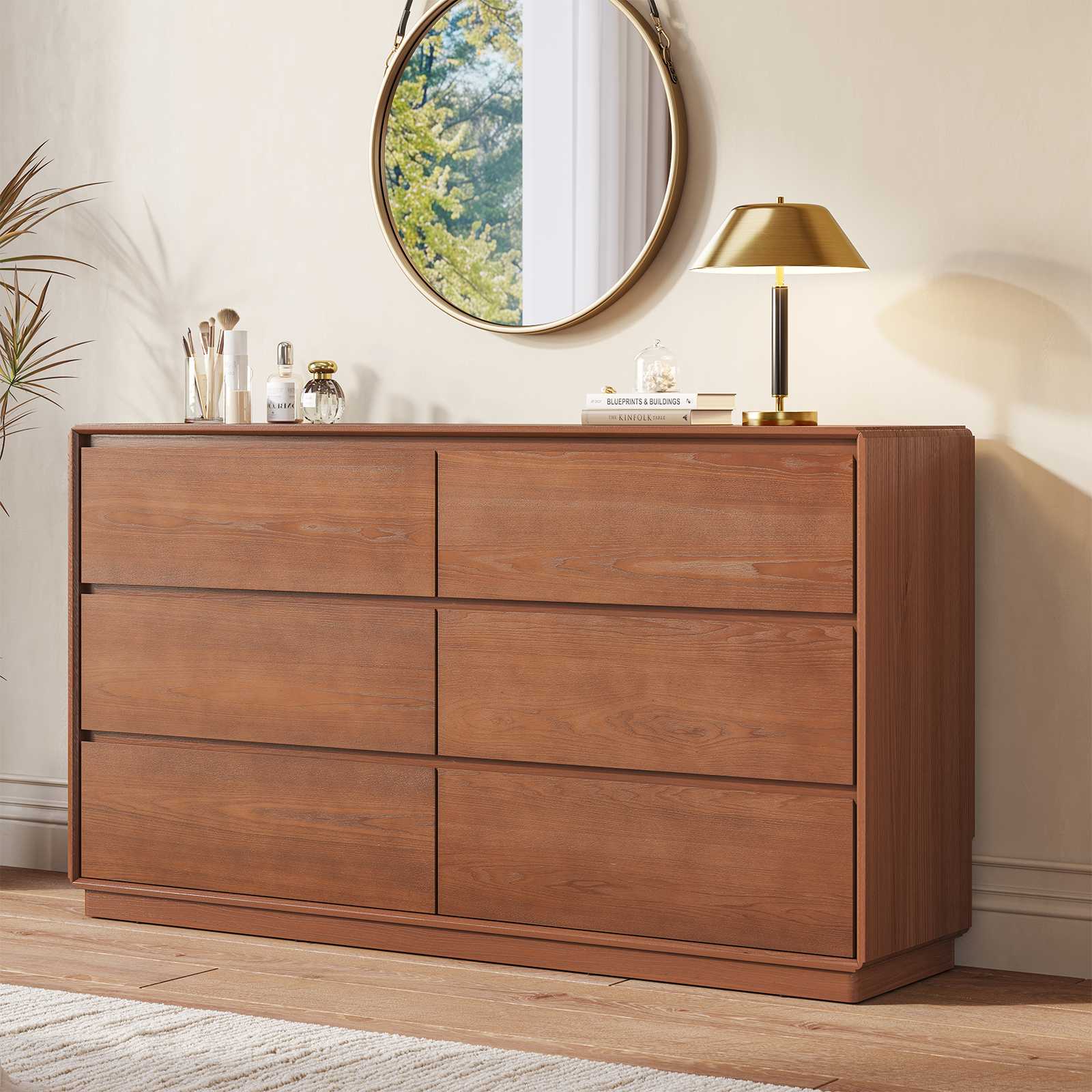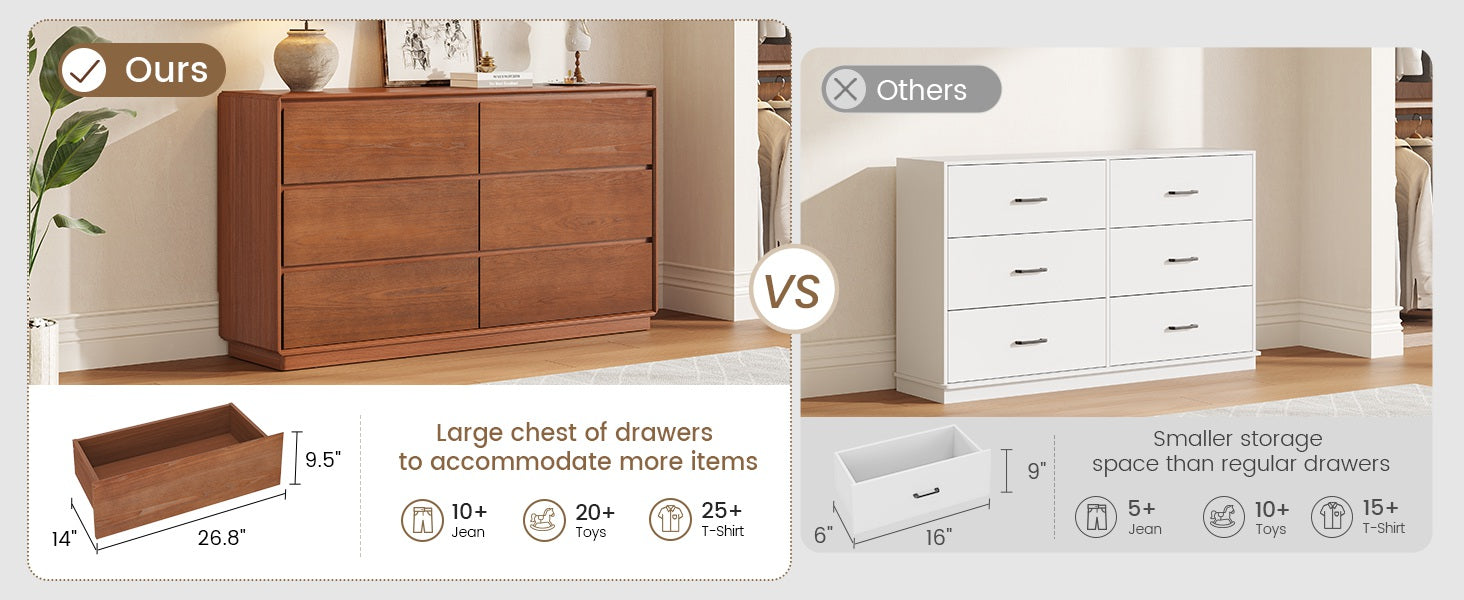【Spacious Storage Solution】This 6 drawer dresser features thoughtfully designed, handleless drawers, offering ample storage space (Dresser size:55.2" W x 33.7" H x 15.8" D). Noise-free drawer operation won’t disrupt sleep. The drawers use bottom-mounted drawer slides to withstand more weight. The spacious top is perfect for displaying lamps, clocks, plants, or picture frames, adding warmth and personality to your room.