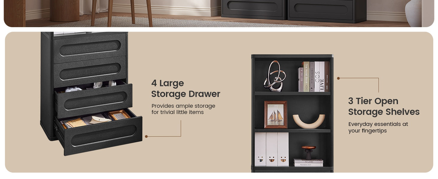 • Ample Storage: 3 shelves + 4 pull-out drawers, versatile for essentials.