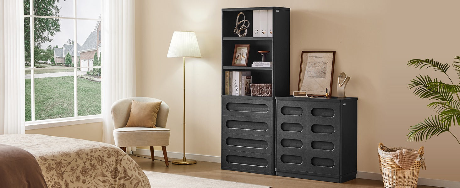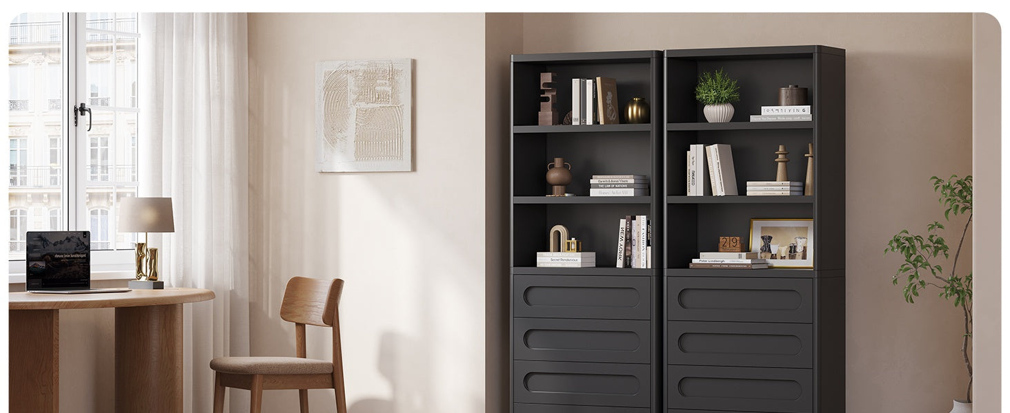 【Ample Storage Space】This tall bookcase with storage function has 3 shelves and 4 fully pull-out drawers to ensure that you have plenty of space for all your books and accessories. Whether it is used as a bedroom bookcase or a large bookcase in the living room, it can meet all your storage needs