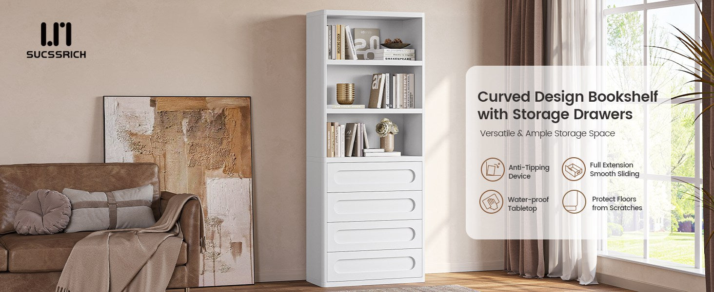 SUCSSRICH 72.1 Inch Bookcase with 4 Drawers Large Bookshelves Cabinet with 3 Storage Shelves for Living Room Bedroom Home Office White
