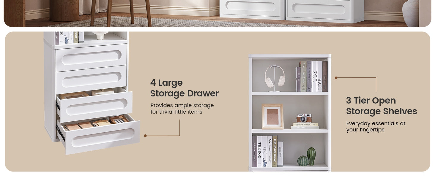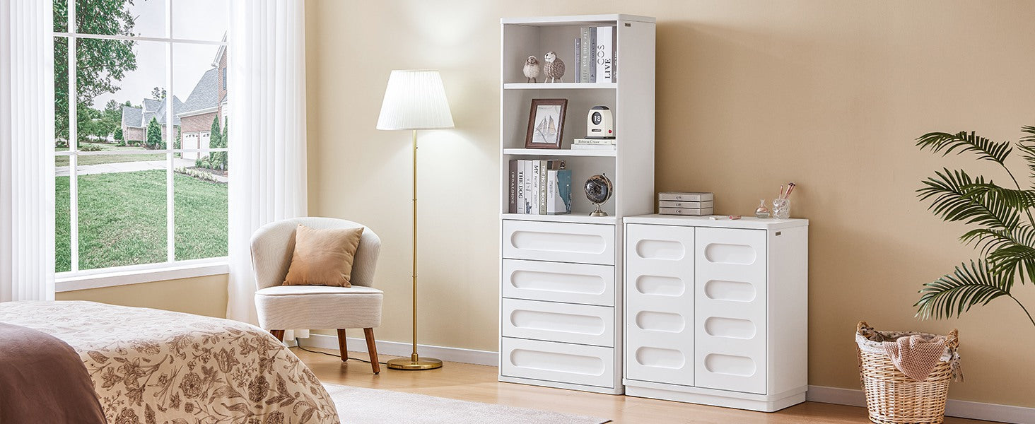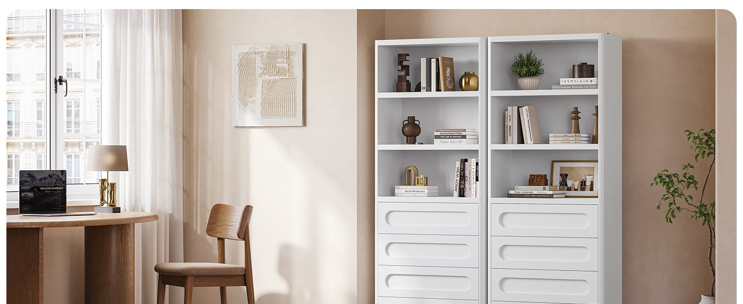 【Ample Storage Space】This tall bookcase with storage function has 3 shelves and 4 fully pull-out drawers to ensure that you have plenty of space for all your books and accessories. Whether it is used as a bedroom bookcase or a large bookcase in the living room, it can meet all your storage needs