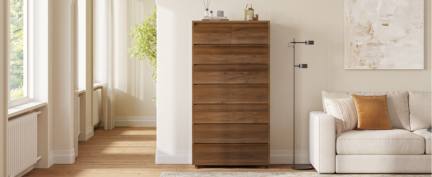 【Versatile for Multiple Spaces】The tall chest of drawers is an essential choice for storing clothes and personal accessories in the bedroom. In the entryway or foyer, it can be used to store keys, mail, and outdoor gear. In the living room, it can hold magazines, coasters, and even audio-visual equipment such as DVDs, keeping the living room tidy and organized. This multi-functional storage cabinet is cleverly designed to blend perfectly into various home environments, meeting the storage needs of any family.